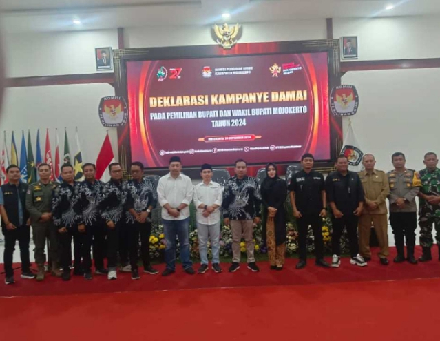 Deklarasi Kampanye Damai tersebut, ditandai dengan tanda tangan dari kedua pasangan calon bupati dan wakil bupati, kemudian pimpinan partai politik yang disaksikan oleh jajaran Forkompinda Kabupaten Mojokerto