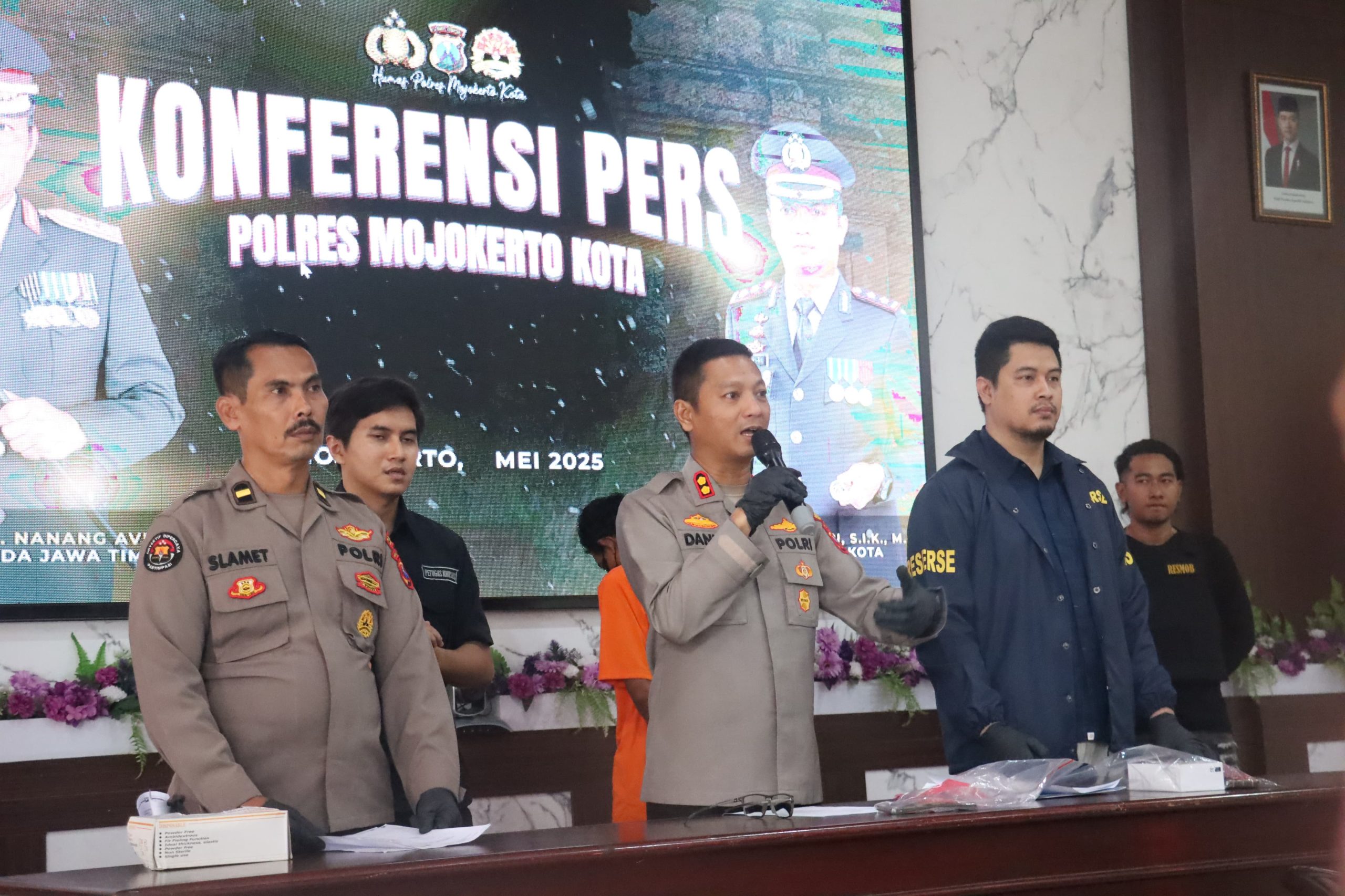 Kasus ini diungkap dalam konferensi pers yang dipimpin langsung oleh Kapolres Mojokerto Kota, AKBP Daniel S. Marunduri, S.I.K., M.H., pada Selasa (27/05/2025) di Aula Hayam Wuruk, Mapolres Mojokerto Kota.