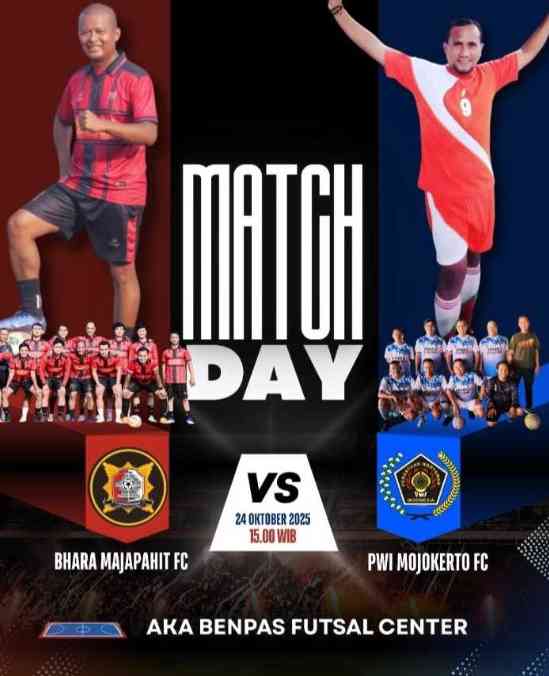 DIGDAYA NEWS.COM / MOJOKERTO – Suasana keakraban akan menyelimuti laga persahabatan bertajuk Match Day Futsal yang mempertemukan Tim PWI Mojokerto FC melawan Bhara Majapahit FC, Jumat (24/10/2025) mendatang. Pertandingan ini bakal digelar di Lapangan AKA Benpas Futsal, Kota Mojokerto.