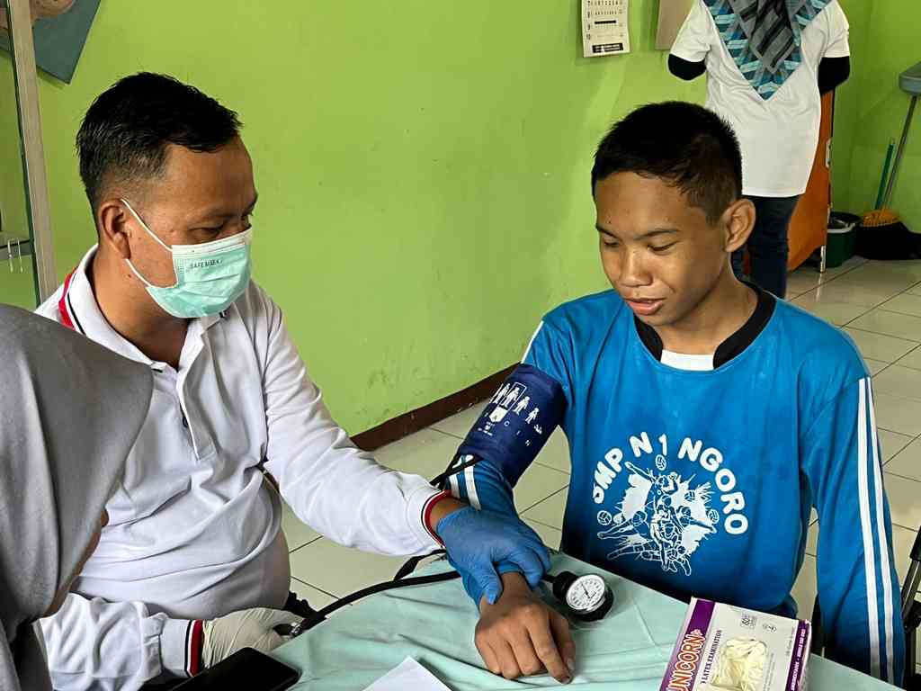 Sejak pagi, aktivitas pemeriksaan berlangsung ramai. Para siswa menjalani berbagai pengecekan, mulai dari tekanan darah, tinggi dan berat badan, pemeriksaan kesehatan mata dan gigi, tes buta warna, hingga skrining anemia khusus bagi siswi. Pemeriksaan dilakukan oleh tim kesehatan Puskesmas Ngoro yang hadir lengkap dengan tenaga medisnya.