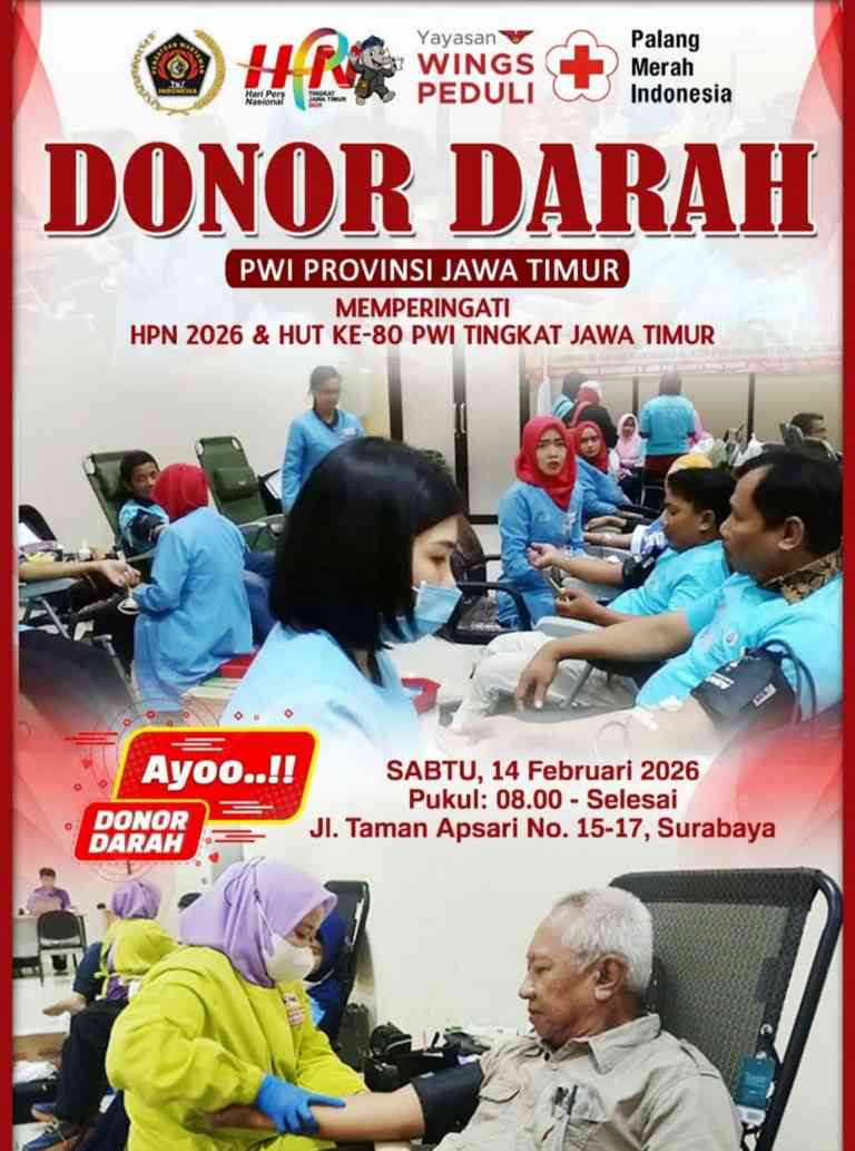 DIGDAYA NEWS. COM/ SURABAYA – Memeriahkan rangkaian peringatan Hari Pers Nasional (HPN) 2026, Persatuan Wartawan Indonesia (PWI) Provinsi Jawa Timur kembali menggelar kegiatan donor darah bekerja sama dengan Palang Merah Indonesia (PMI) Kota Surabaya.