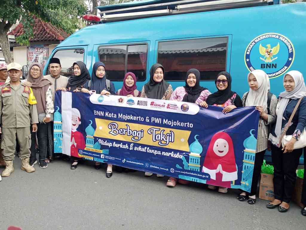 DIGDAYA NEWS. COM/ MOJOKERTO – Badan Narkotika Nasional (BNN) Kota Mojokerto bersama Persatuan Wartawan Indonesia (PWI) Mojokerto Raya menggelar kegiatan sosial dengan membagikan ratusan paket takjil kepada masyarakat di kawasan Alun-Alun Wiraraja, Kota Mojokerto, Jumat (13/3/2026). Sore