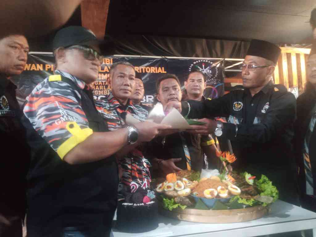 Ketua LSM GMBI Distrik Jatim Sugeng SP saat serahkan potongan tumpeng pada ketua LSM GMBI Mojokerto Raya Saiful Bakhri di momentum perayaan HUT GMBI Ke - 24